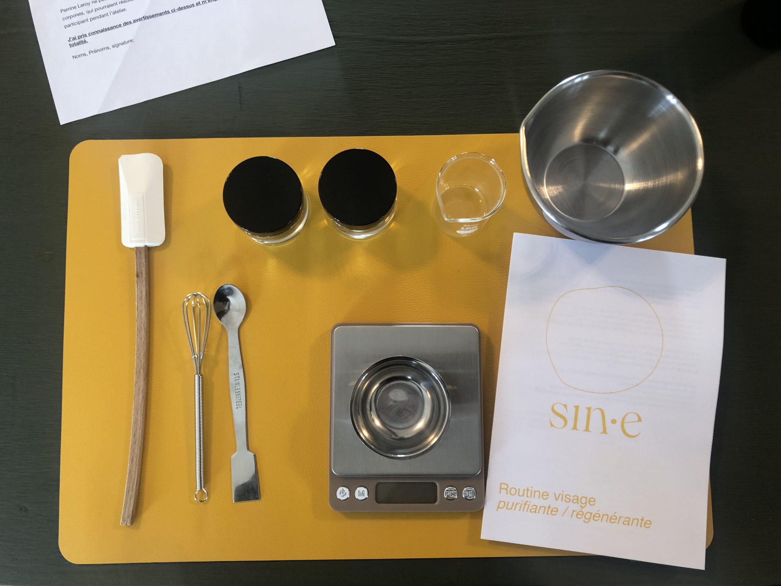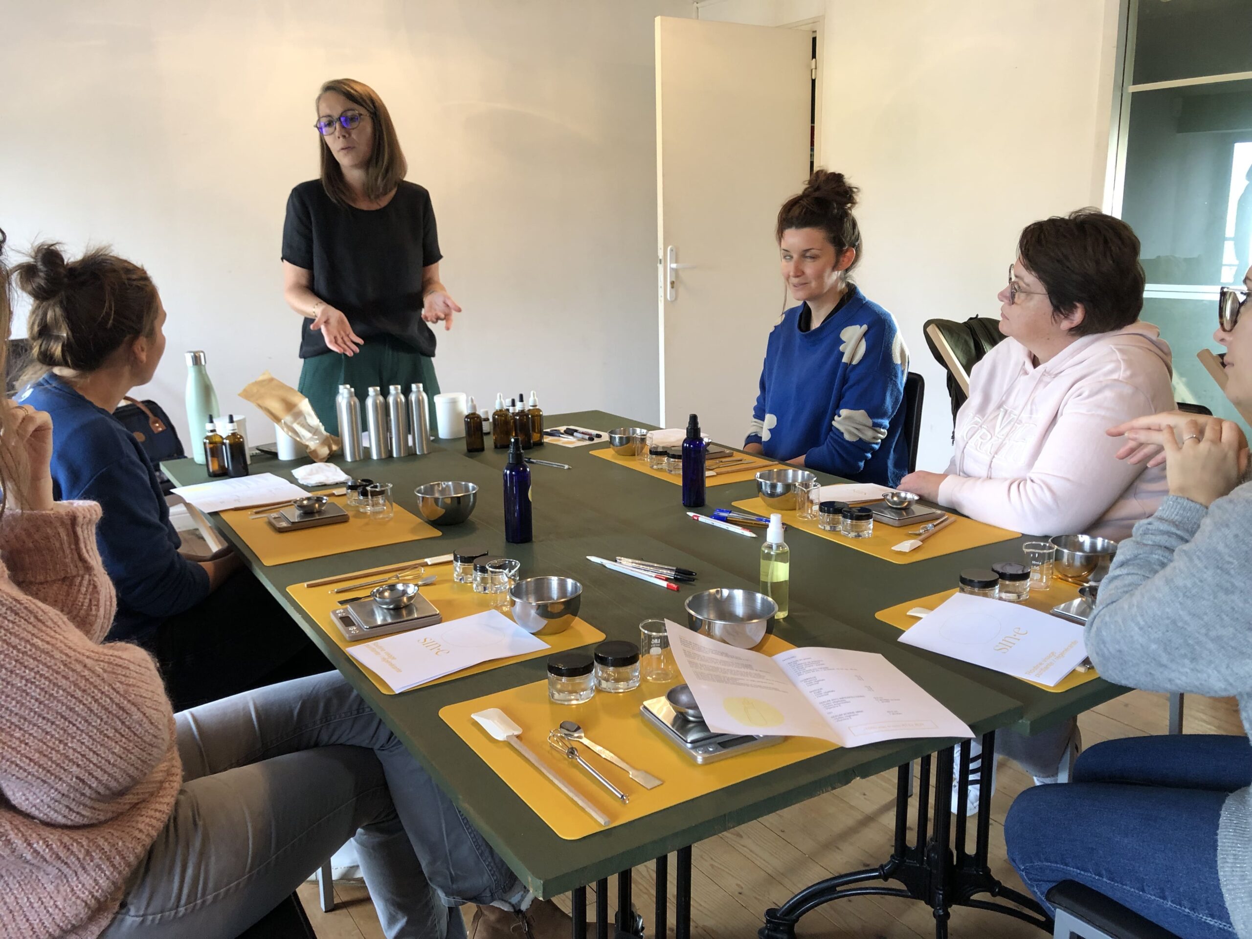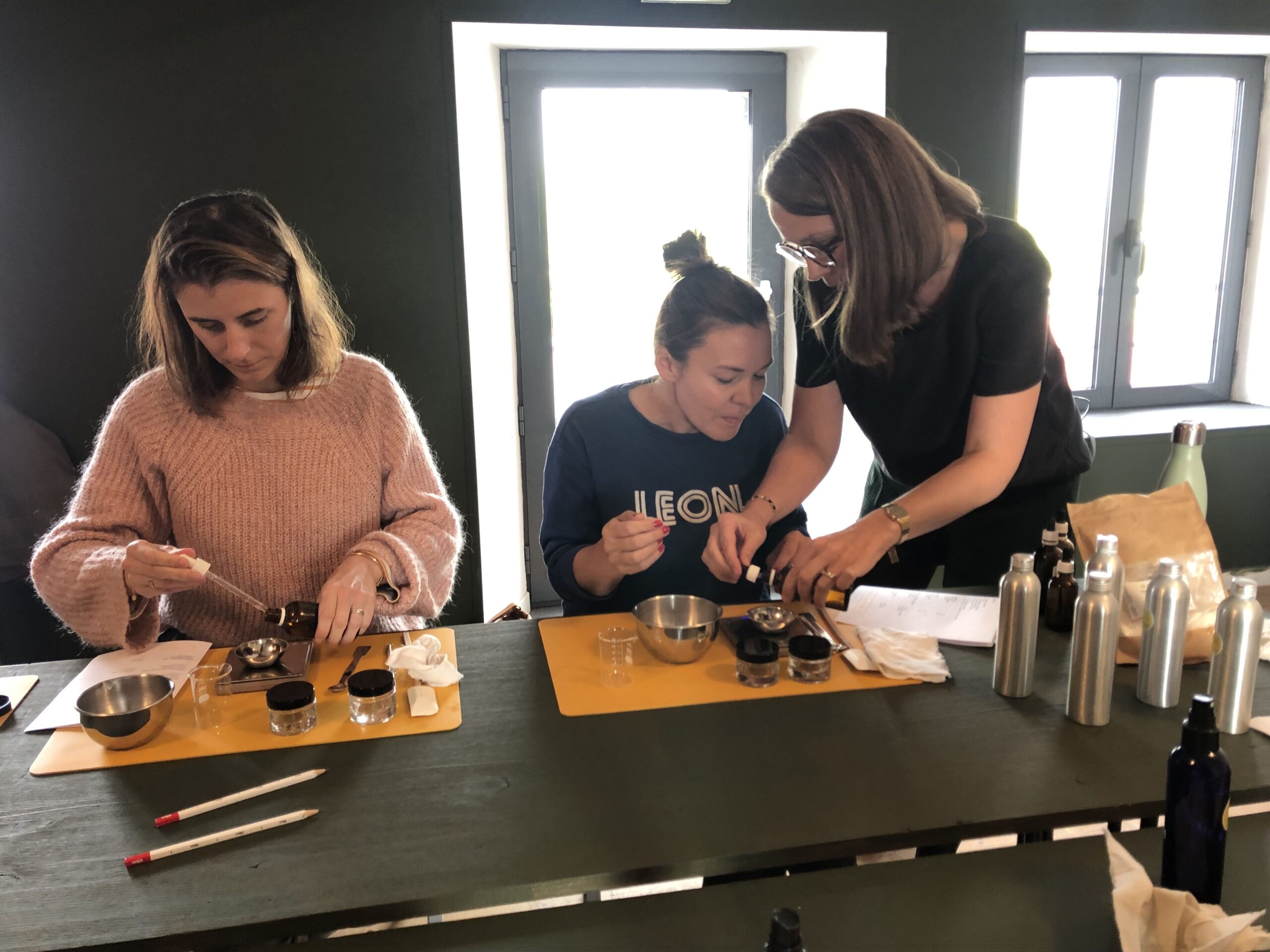 Aujourd’hui je suis au Maul, à Pornic pour mon deuxième atelier cosmétique avec Perrine Leroy. Perrine a fondé la marque de cosmétiques sin-e, bios et éco-responsables.