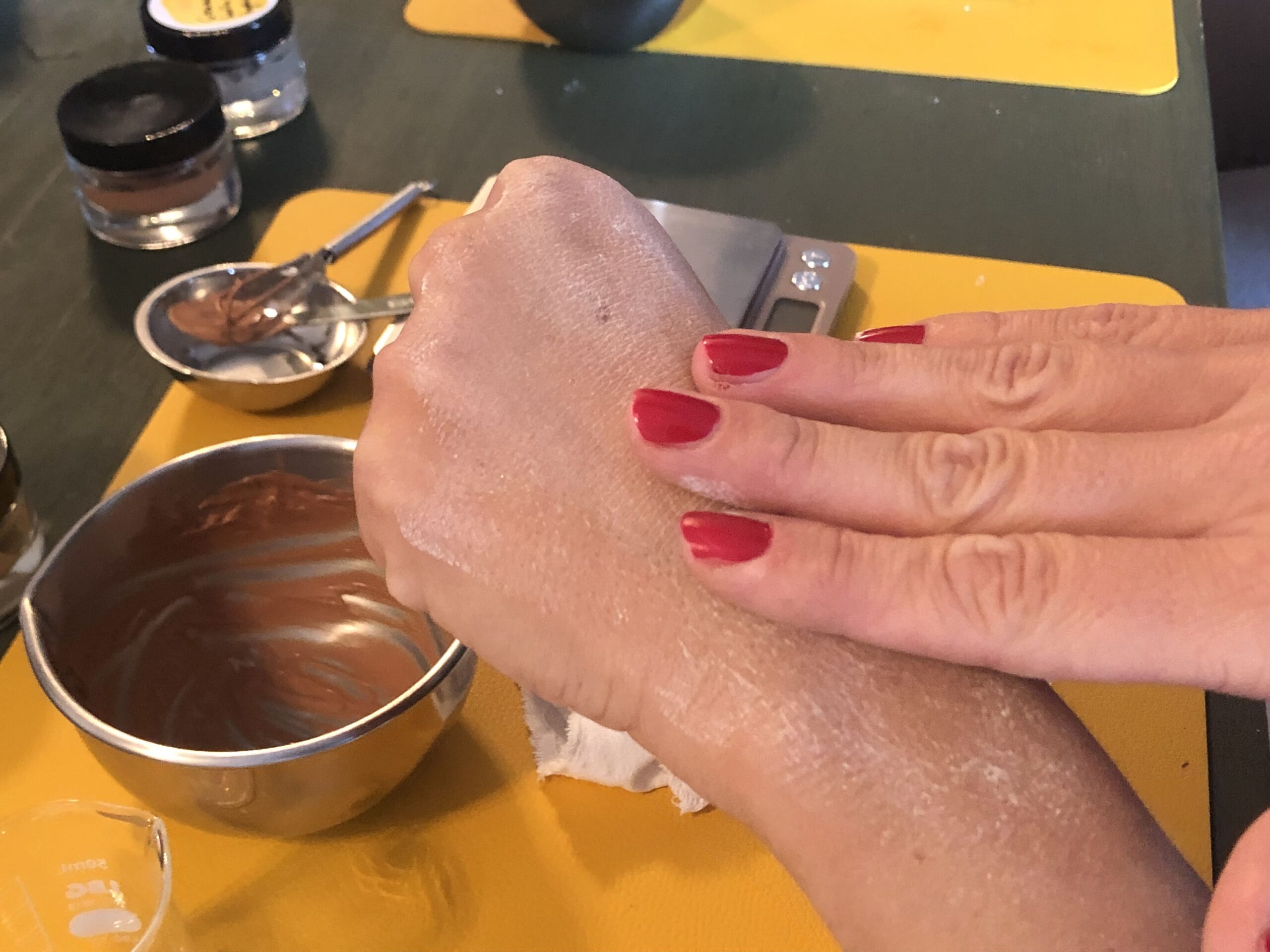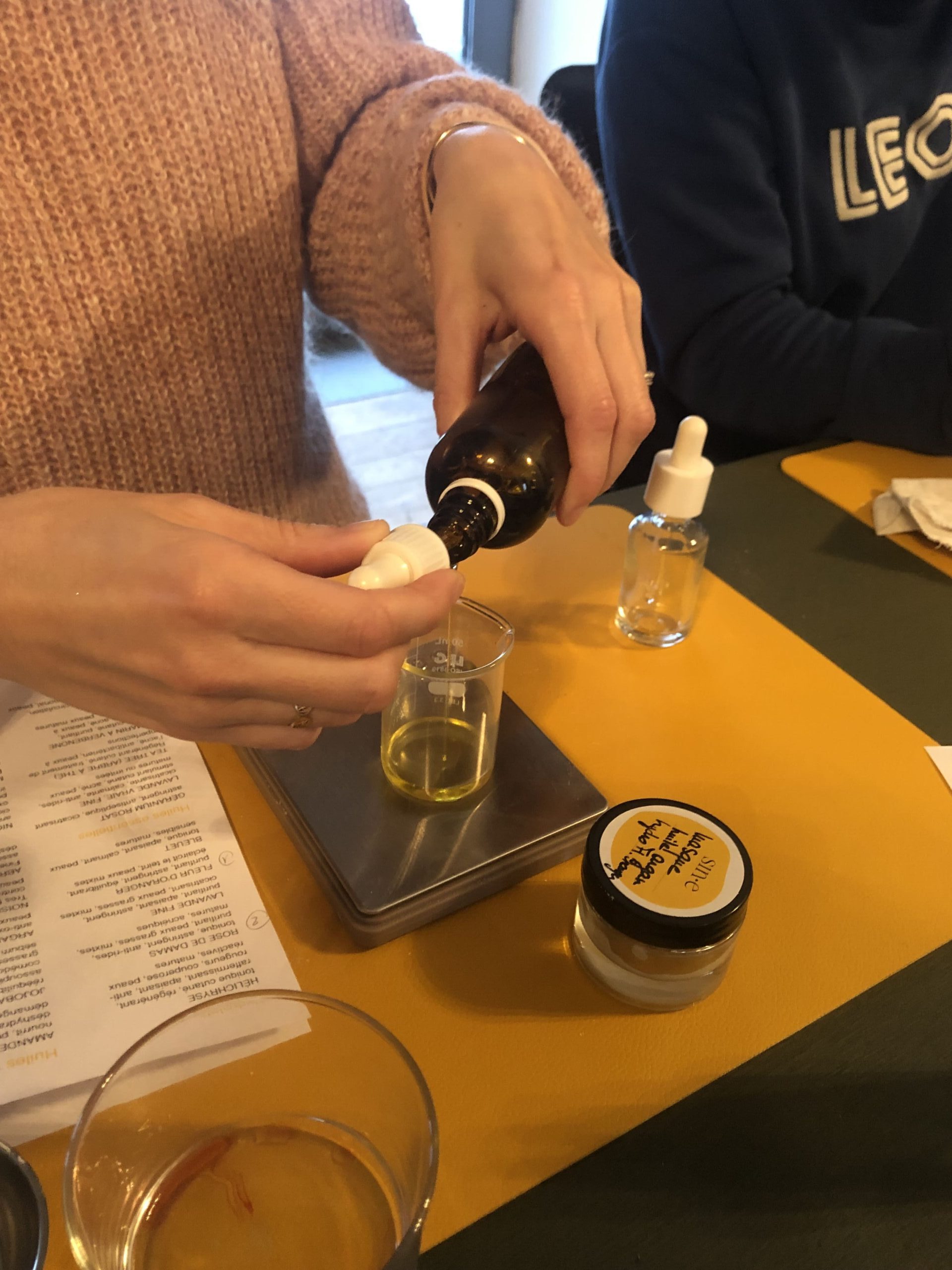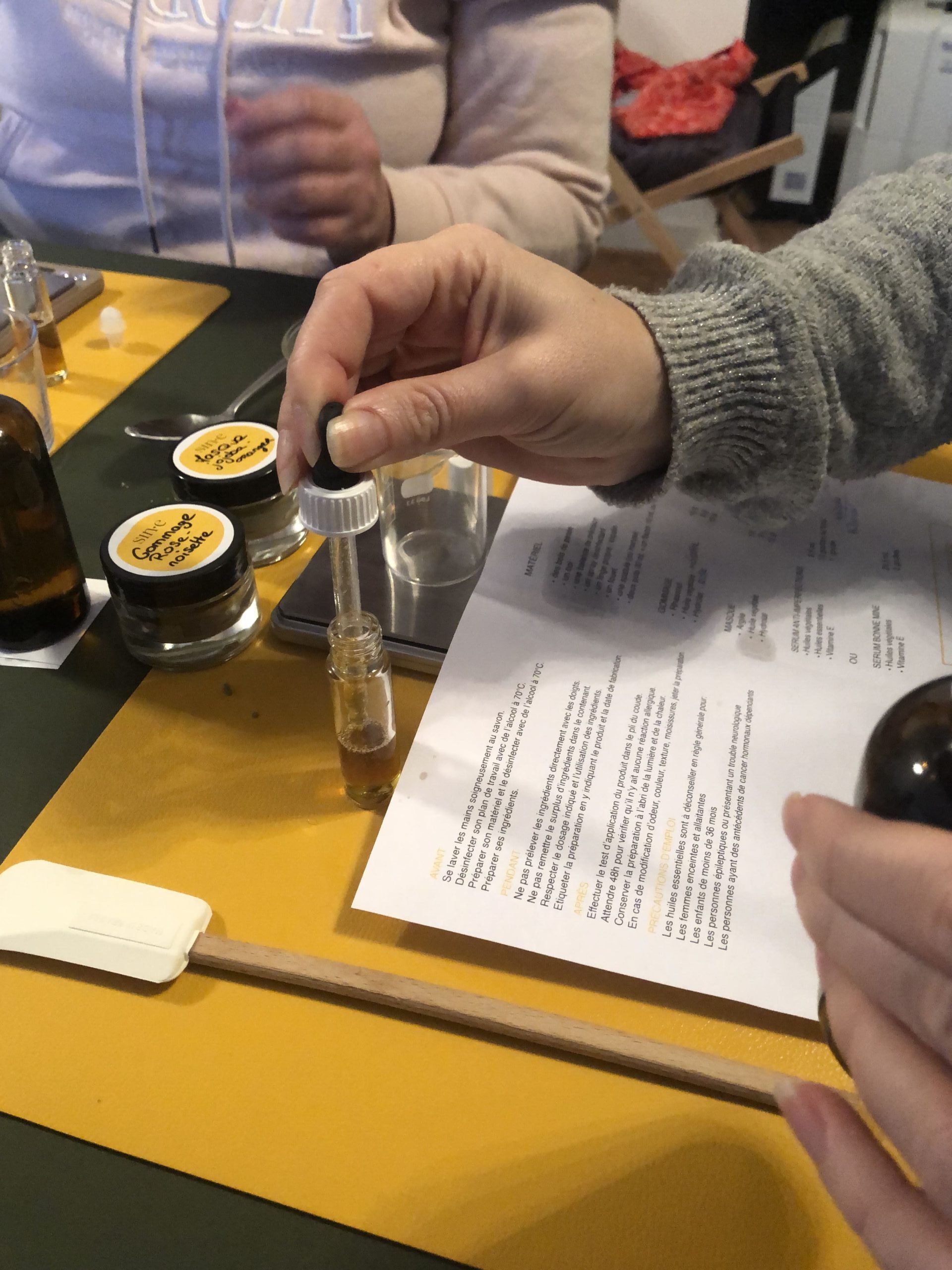 Perrine commence par présenter le programme puis les différents produits. Nous allons débuter avec le gommage au rhassoul. Le grain est très fin et cela permet de ne pas agresser la peau. Perrine nous passe les hydrolats et les huiles pour que nous les sentions. Chacune fait son choix en tenant compte des propriétés de chaque hydrolat et des odeurs qui nous conviennent. Chacune partage son impression : la fleur d’oranger rappelle le gâteau de Savoie de mamy, la lavande, le désodorisant des toilettes😅 . Les oreilles sont attentives pour certaines : les bonnes élèves se font chambrer. D’autres sont plus dissipées et jouent déjà avec le matériel. C’est vrai que cela donne l’impression que nous allons jouer à la dinette!