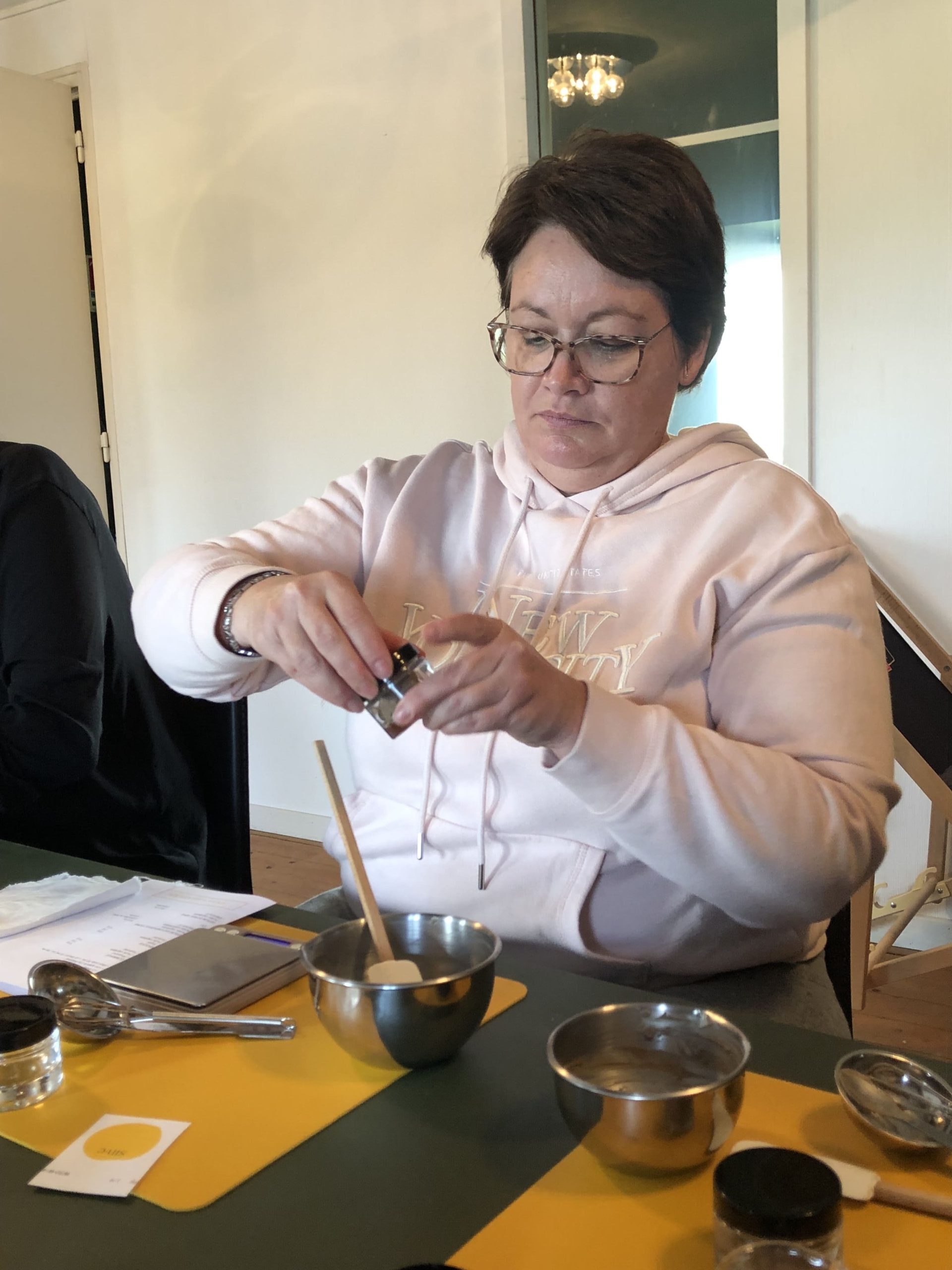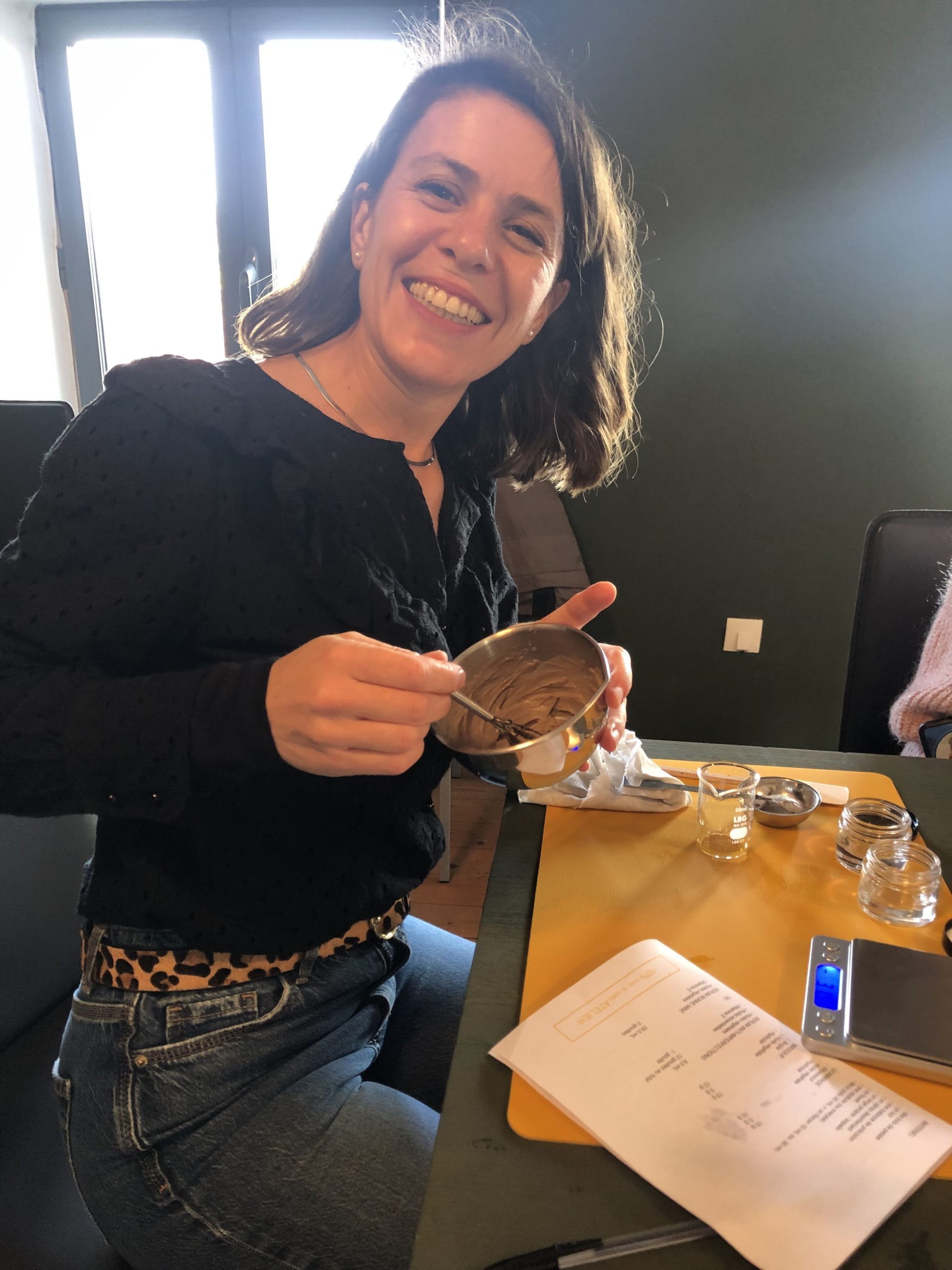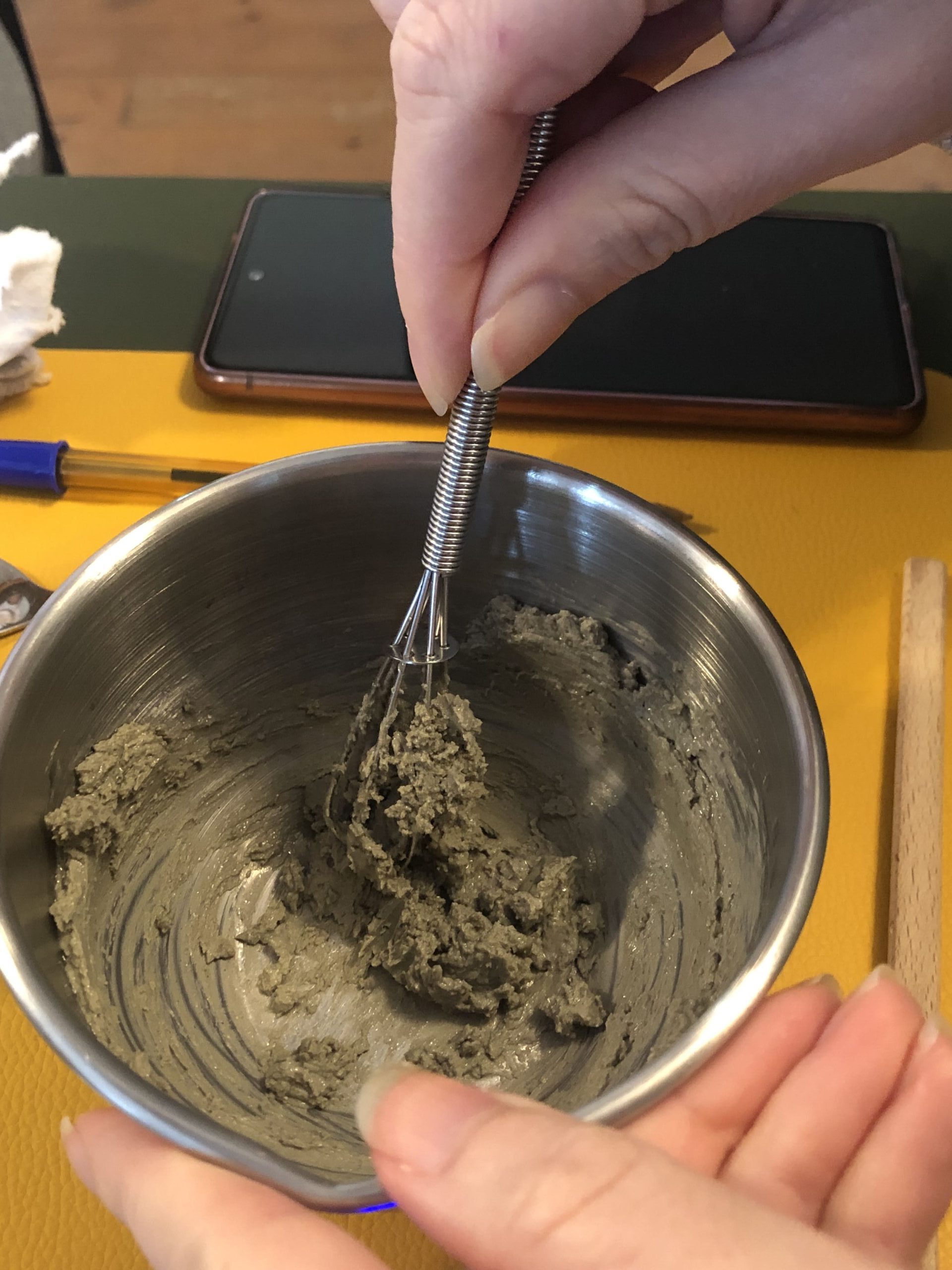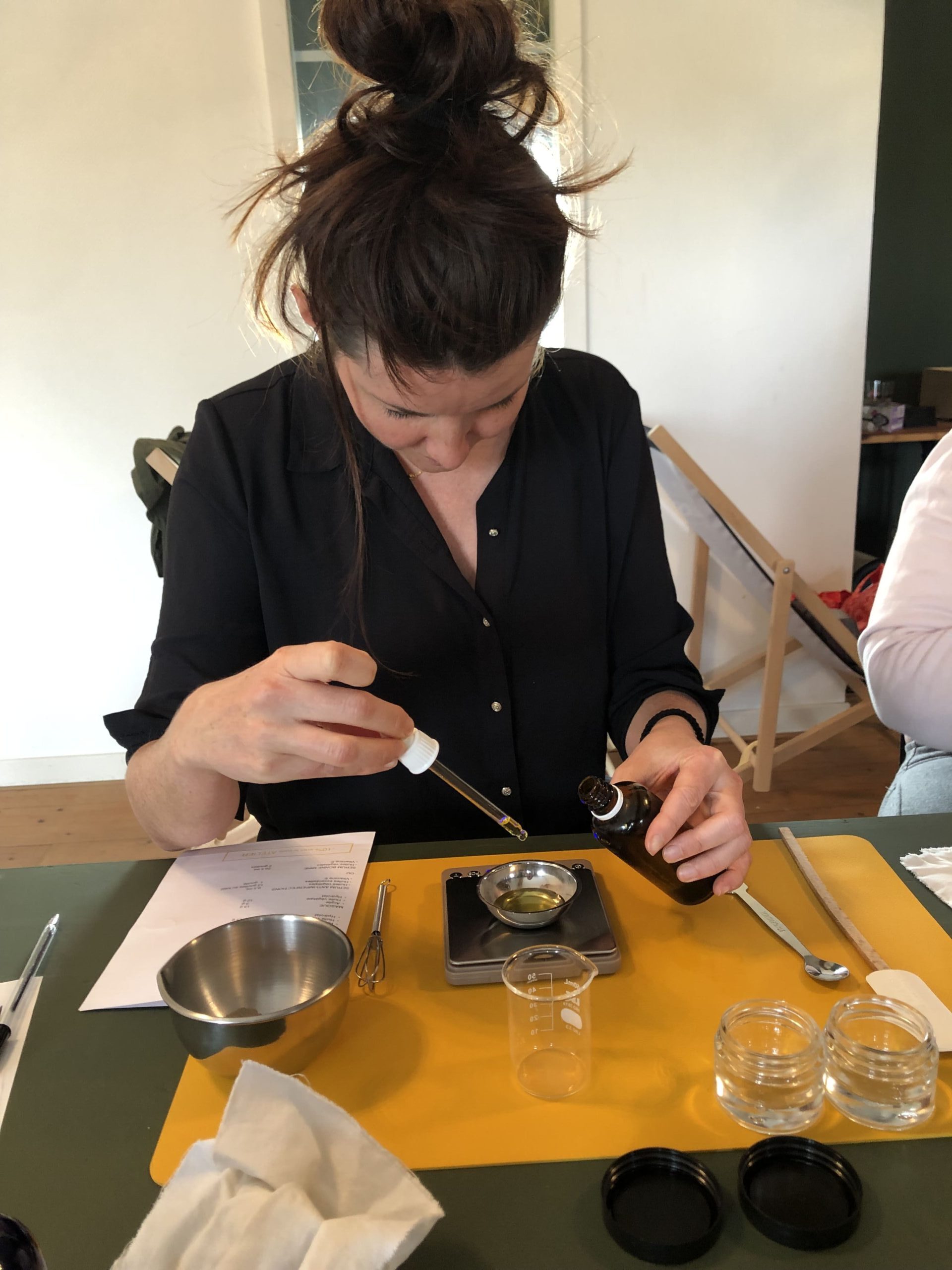 Perrine commence par présenter le programme puis les différents produits. Nous allons débuter avec le gommage au rhassoul. Le grain est très fin et cela permet de ne pas agresser la peau. Perrine nous passe les hydrolats et les huiles pour que nous les sentions. Chacune fait son choix en tenant compte des propriétés de chaque hydrolat et des odeurs qui nous conviennent. Chacune partage son impression : la fleur d’oranger rappelle le gâteau de Savoie de mamy, la lavande, le désodorisant des toilettes😅 . Les oreilles sont attentives pour certaines : les bonnes élèves se font chambrer. D’autres sont plus dissipées et jouent déjà avec le matériel. C’est vrai que cela donne l’impression que nous allons jouer à la dinette!