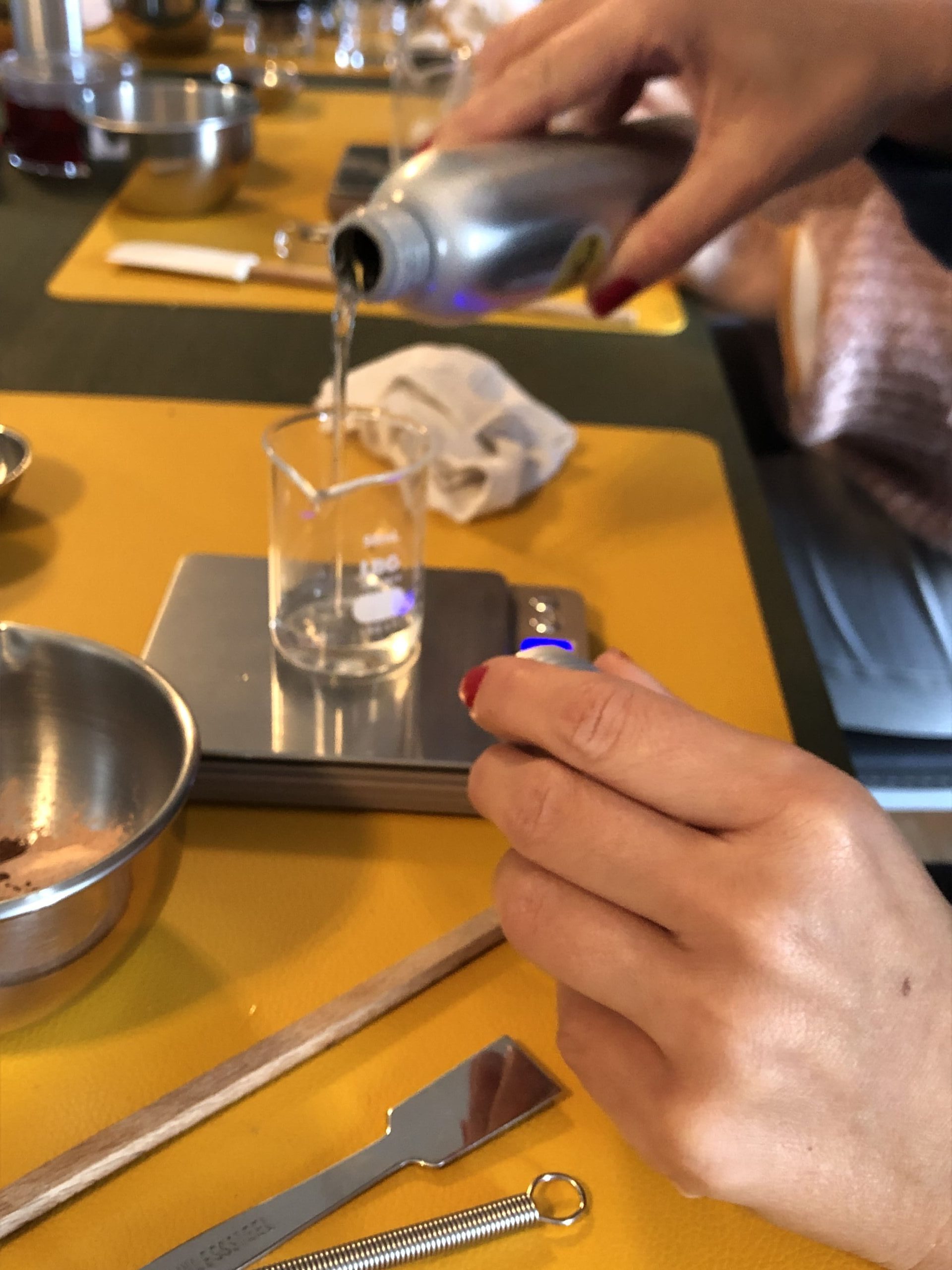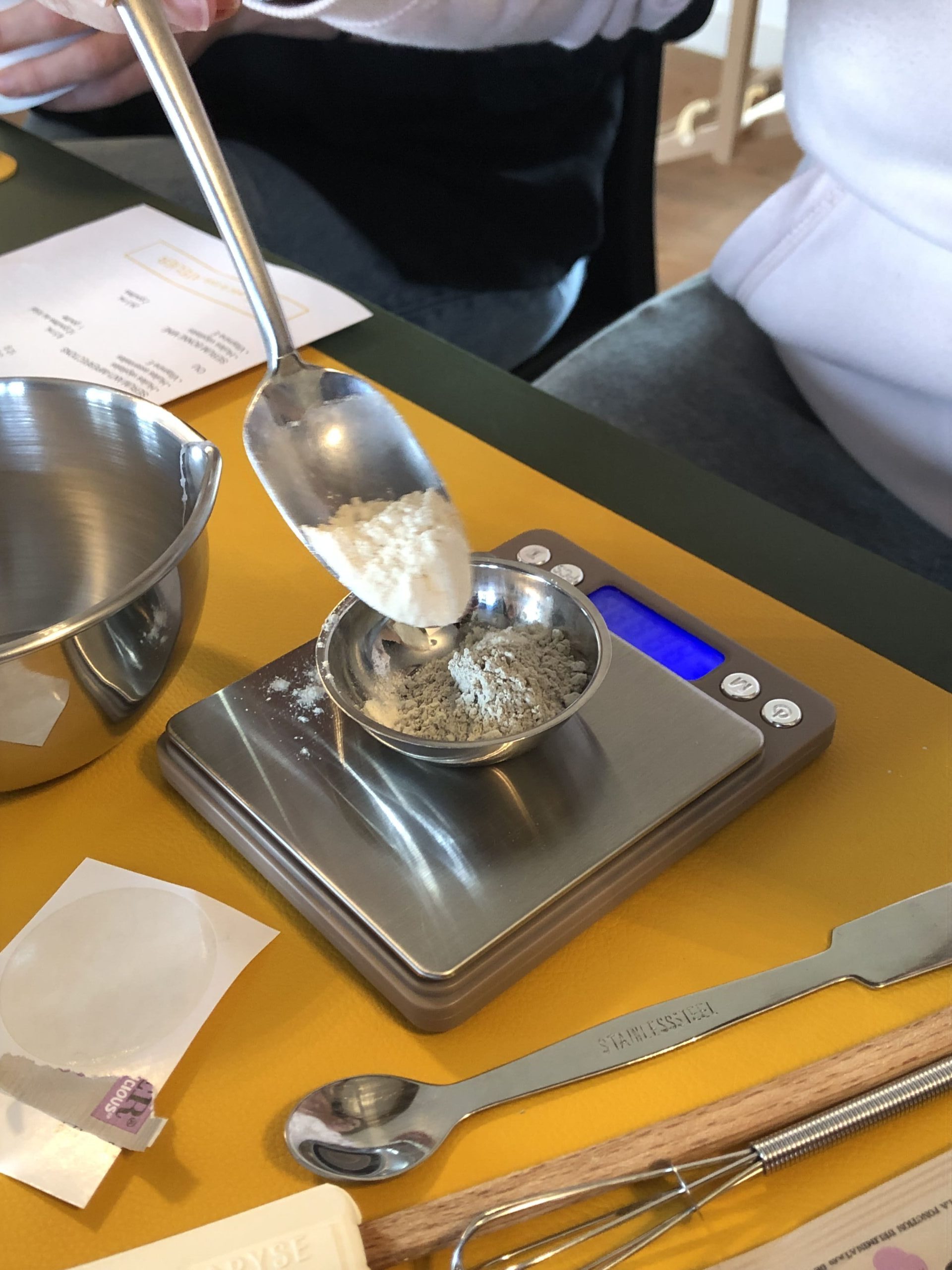 Ensuite nous passons à la pesée. Oups… j’ai mal écouté. J’en ai mis trop. Heureusement Perrine est rassurante et apporte la solution. Perrine est très sollicitée par nos questions : « C’est normal que ça fasse ça ? Pourquoi c’est tout collé ? Qu’est-ce que je fais ? » Calme, elle apporte les réponses. On transvase et voilà ! Premier pot avec gommage c’est fait !