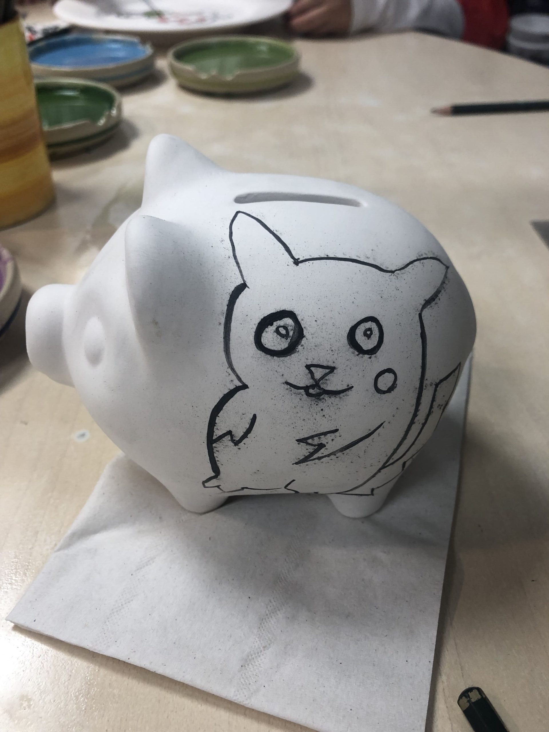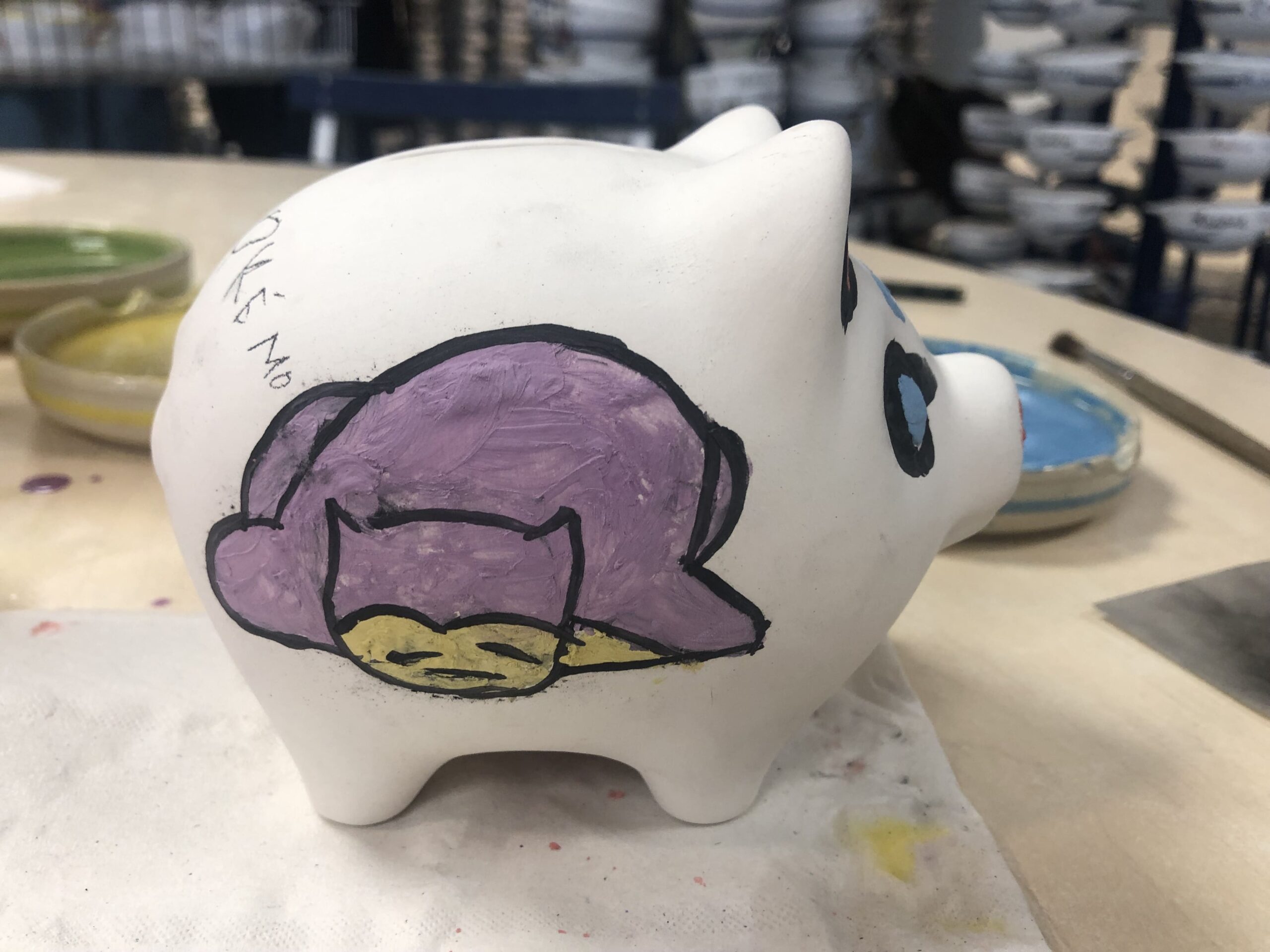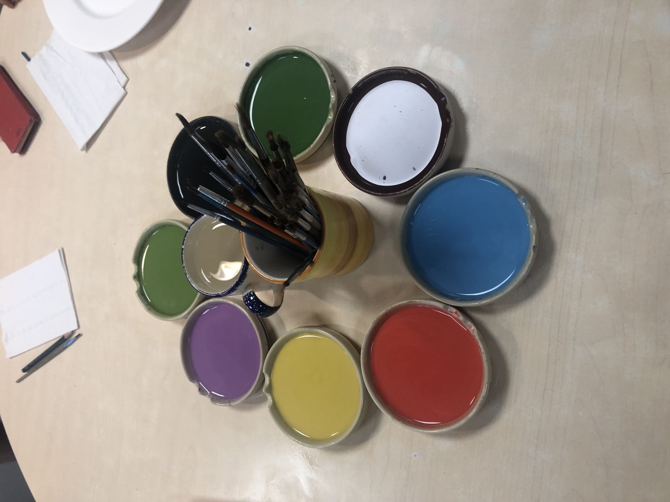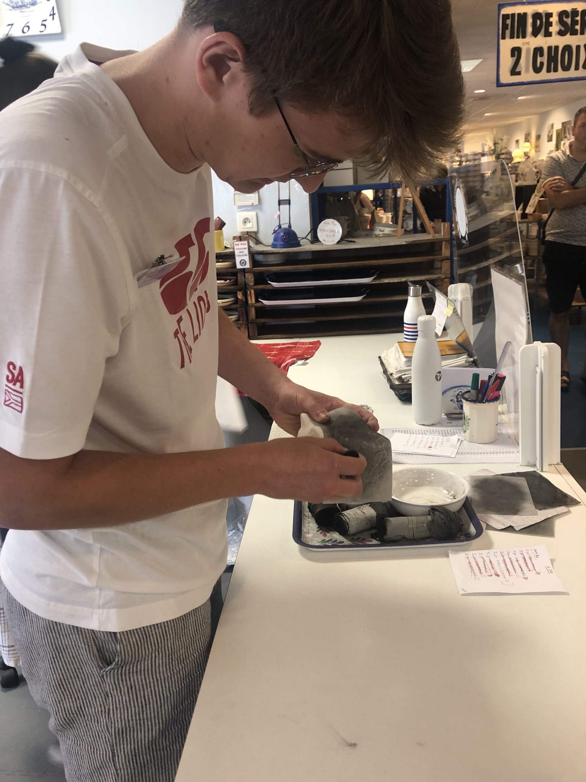 Nous devons écrire notre prénom, notre nom et la date dessous la pièce en faïence choisie au crayon de bois puis repeindre par-dessus pour pouvoir récupérer notre précieux après la cuisson. En effet, petit détail, nous ne pouvons pas récupérer les éléments le jour même. Nous peignons et ensuite, ils les envoient à cuire. Il faut un délai de 3 jours pour récupérer la pièce finie.