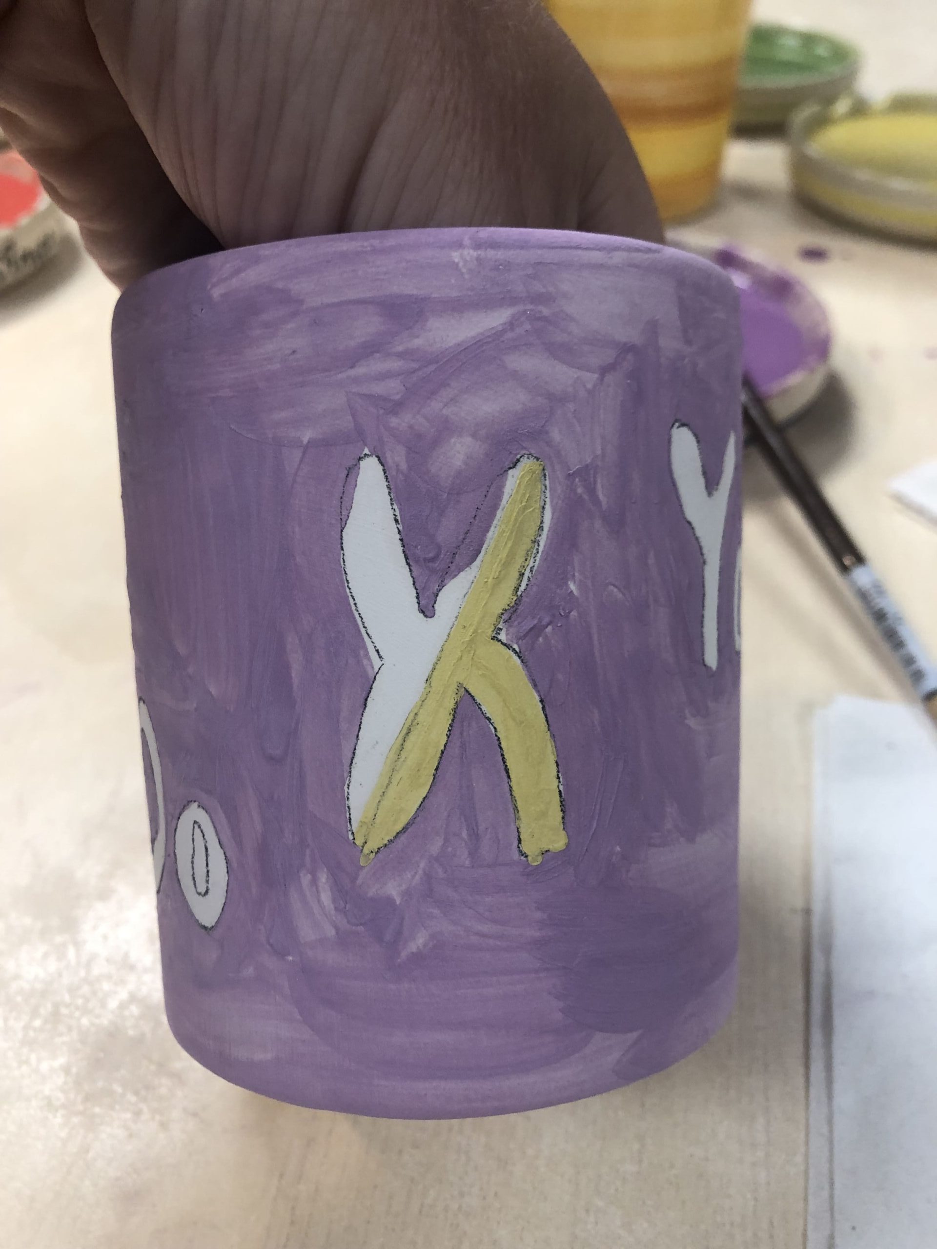 Nous commençons par faire le tour en noir de l’élément pour que ce soit plus simple. Ensuite Pierre peint l’intérieur du motif.  Il y a plusieurs couleurs. Certaines couleurs changent à la cuisson. Voilà qui explique que mon mug soit violet. On croise les doigts pour qu’il devienne bien bleu à la cuisson ! Je l’espère !