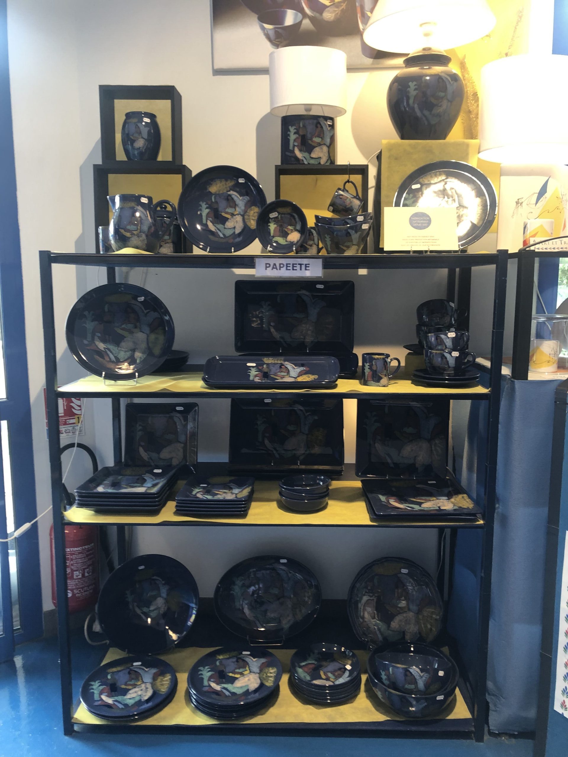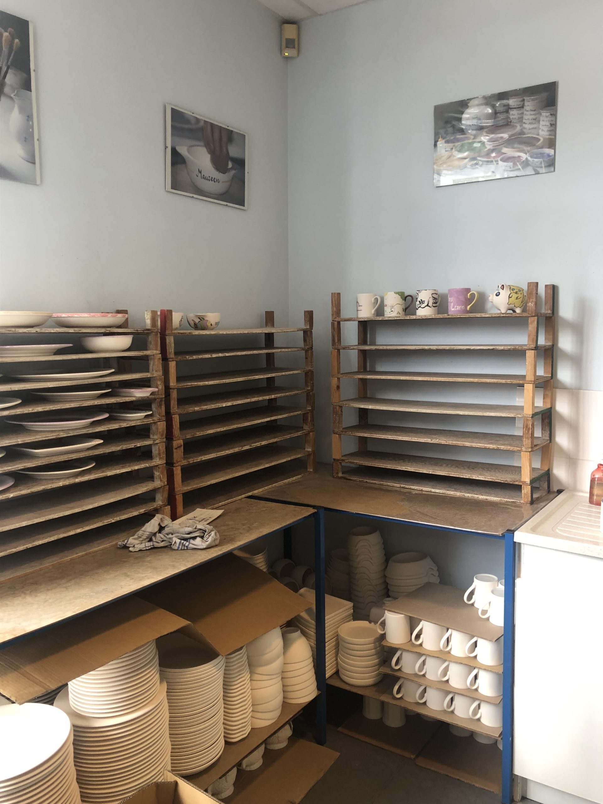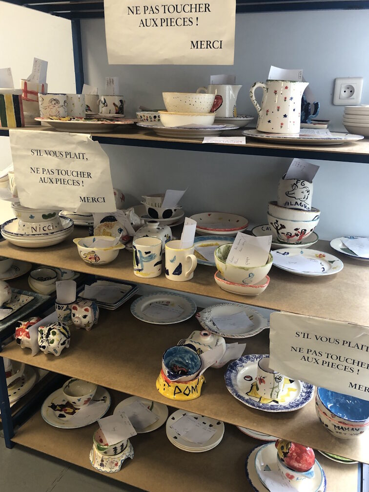A côté se trouve une étagère remplie de création en attente de leur propriétaire suite à la cuisson. Cela donne un aperçu des éléments réalisables.